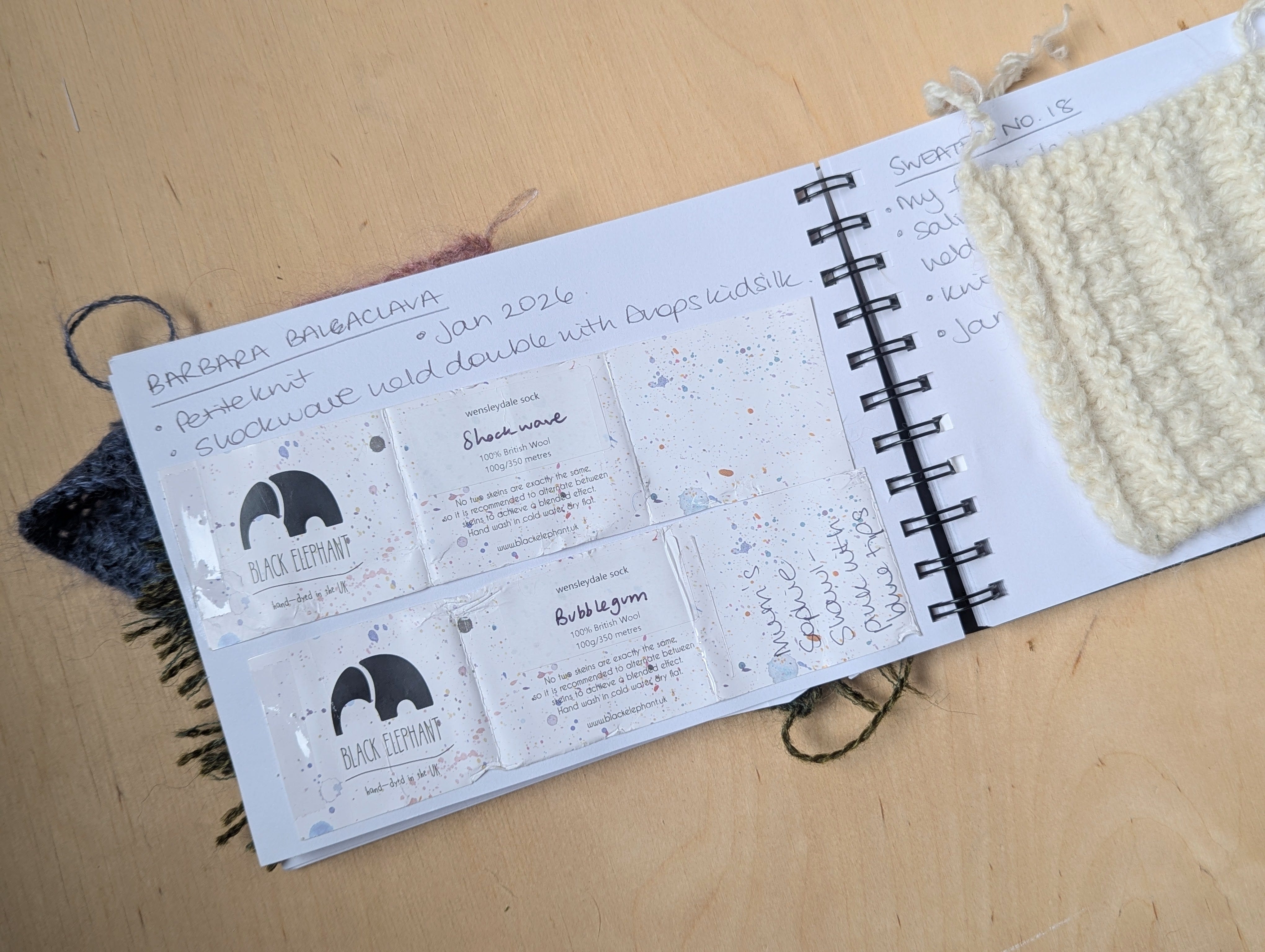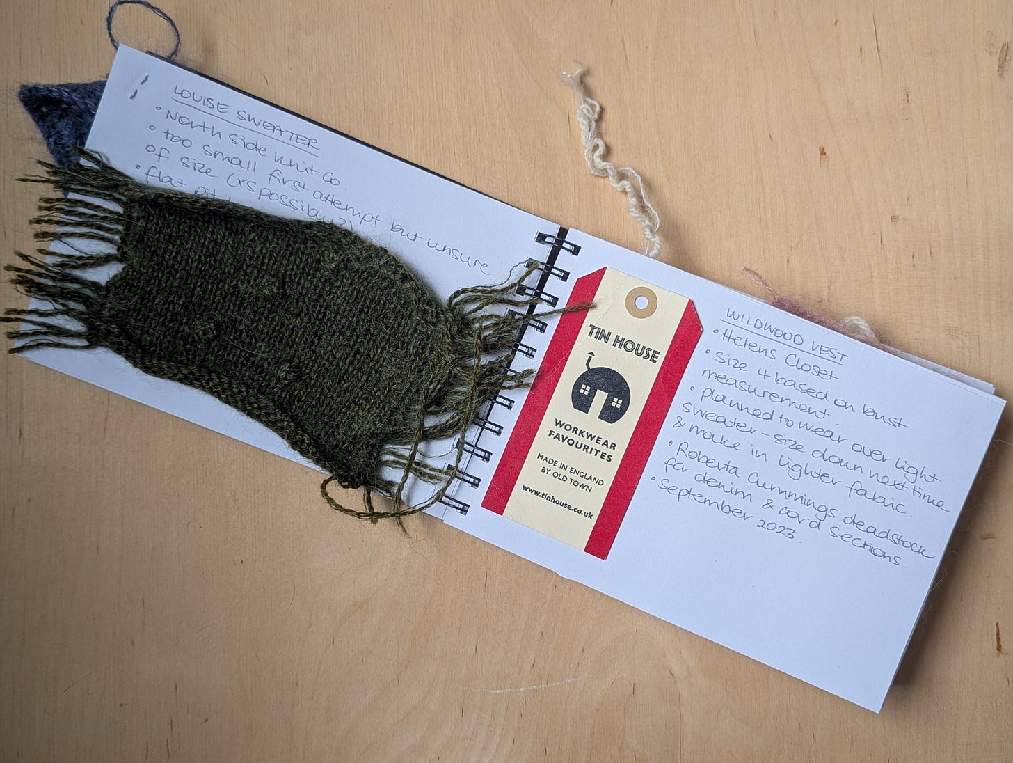 Elise Joy spoke on her newsletter recently, about starting what she called a ‘craft field journal’ and I found this concept very inspiring. The idea is not to be overly curated or aesthetic about your notes, unless that is your chosen creative hobby, but just to get the ideas and thoughts down on paper. Stick in the swatches, the yarn labels, the swing tags. Note down the size of needles, the size of pattern, the size of yarn. It doesn’t need to be pretty, it just needs to be done, so you have a reference for the future.