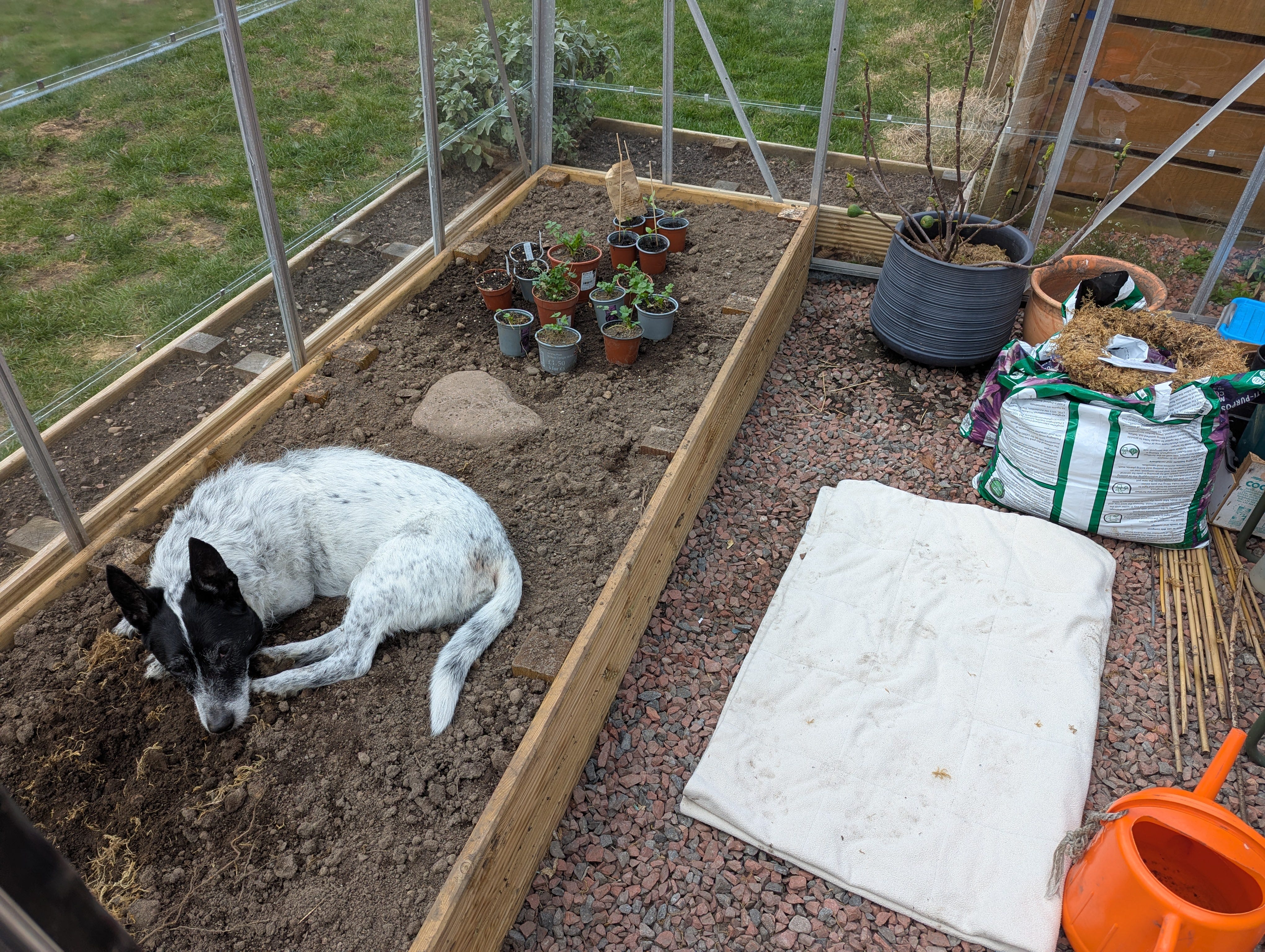 It’s so nice to be finally into the gardening season. The weather up here has been so changeable, with literal snow and sleet interspersed with warmer, sunnier days. I filled the raised bed in the greenhouse (a project I built last year) and provided old Badger a blanket to lie on. He likes the warmth in the greenhouse but for some reason though, he prefers to lie on the bare earth. He's definitely being locked out of the greenhouse when the tomatoes go in, hopefully some time in the next couple of weeks. Our final frost date is late April/early May so I might hold off a little bit longer. I’ve got a potting bench to build in the meantime.