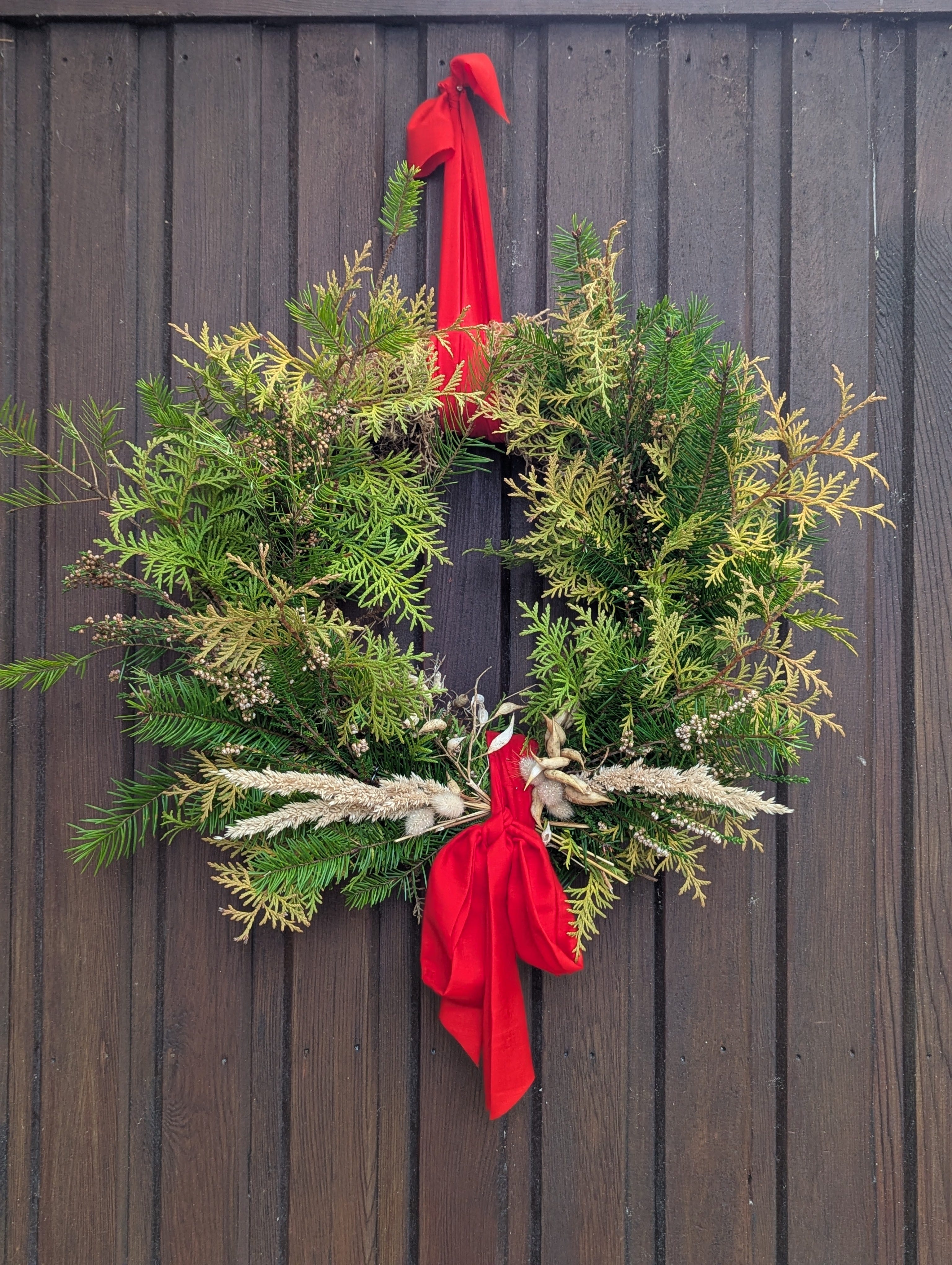My Christmas decorations are packed away but I’m leaving my winter wreath up for a bit longer. The ribbon is vintage kimono silk from my stash, and the foliage, seed heads and dried grasses are all from my garden. I’m glad I made time to make it over Christmas, our festive plans went a bit awry between food poisoning, a ceiling leak, and my work intruding into our personal lives. I made time to bake and ice my Christmas cake, which is quietly waiting in a cupboard for me to cut into it, and create this wreath.